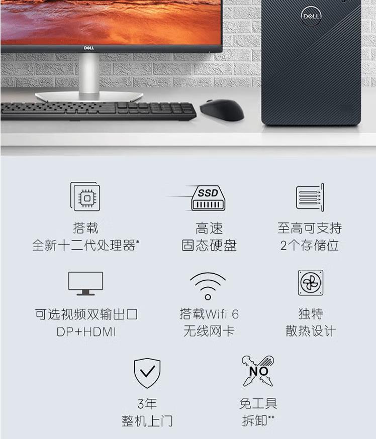 戴爾(DELL)靈越3910-18N6家用辦公學(xué)習(xí)網(wǎng)課娛樂(lè)臺(tái)式電腦主機(jī)12代i5 16G 256G+1T獨(dú)顯 加27英寸全高清顯示器(S2721NX)