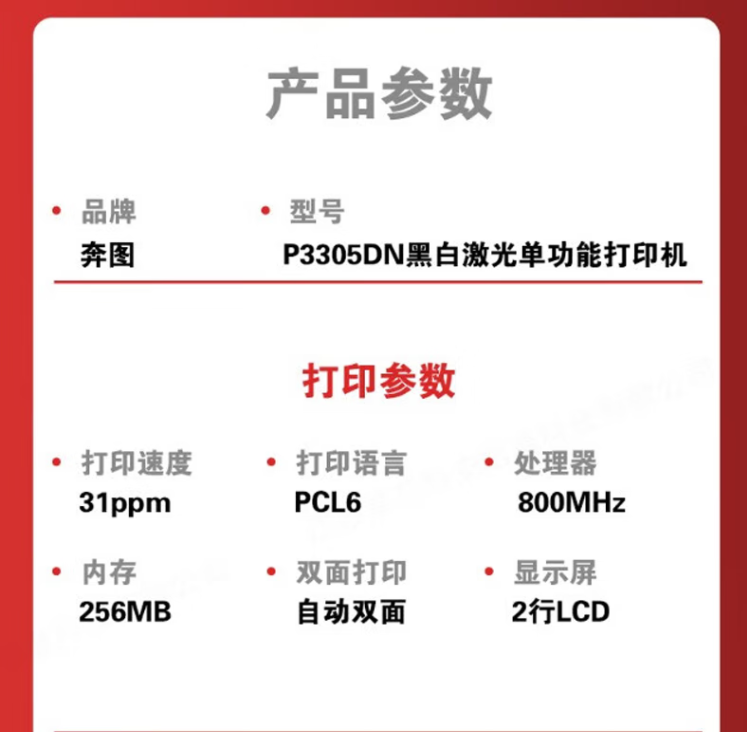 參數(shù) [品牌] 奔圖 [型號(hào)] P3305DN [毛重] 7.5KG