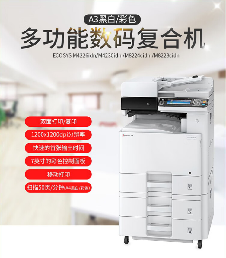 京瓷M4226idn 黑白激光 打印26頁/分鐘 復(fù)印 掃描 自動(dòng)輸稿器 有線網(wǎng)絡(luò) 落地紙盒 30萬頁硒鼓壽命 支持國(guó)產(chǎn)系統(tǒng)